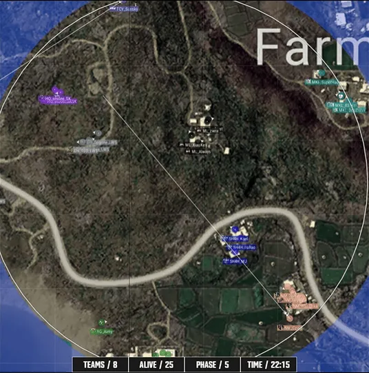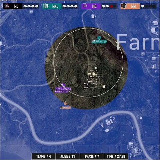 阶段6,圈型刷到农场附近,HQ开车装机GH方向,HQ一换四淘汰GH,另外一边TCY与MKL交战,TCY独狼连续打倒多人后被一颗手雷淘汰,同时NM选择进攻5H4H房区,NM打掉5H4H之后被远点枪线淘汰两人。